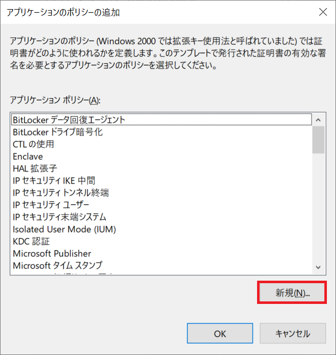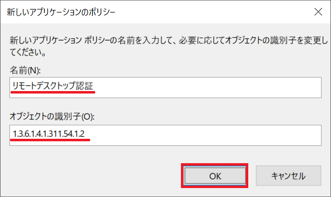 5-e. 名前 に リモートデスクトップ認証 と入力し、オブジェクト識別子 (OID) の値に1.3.6.1.4.1.311.54.1.2 と入力して、OK ボタンをクリックします。