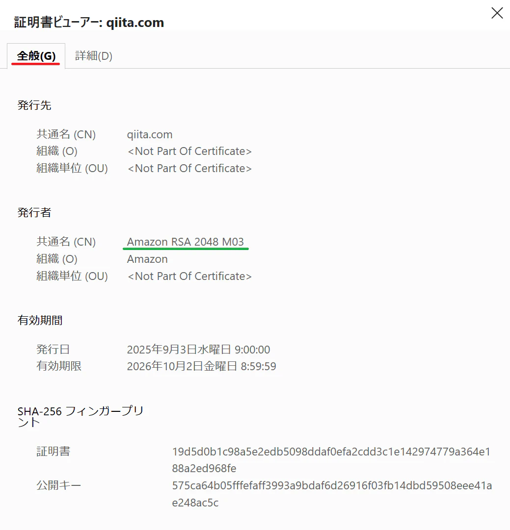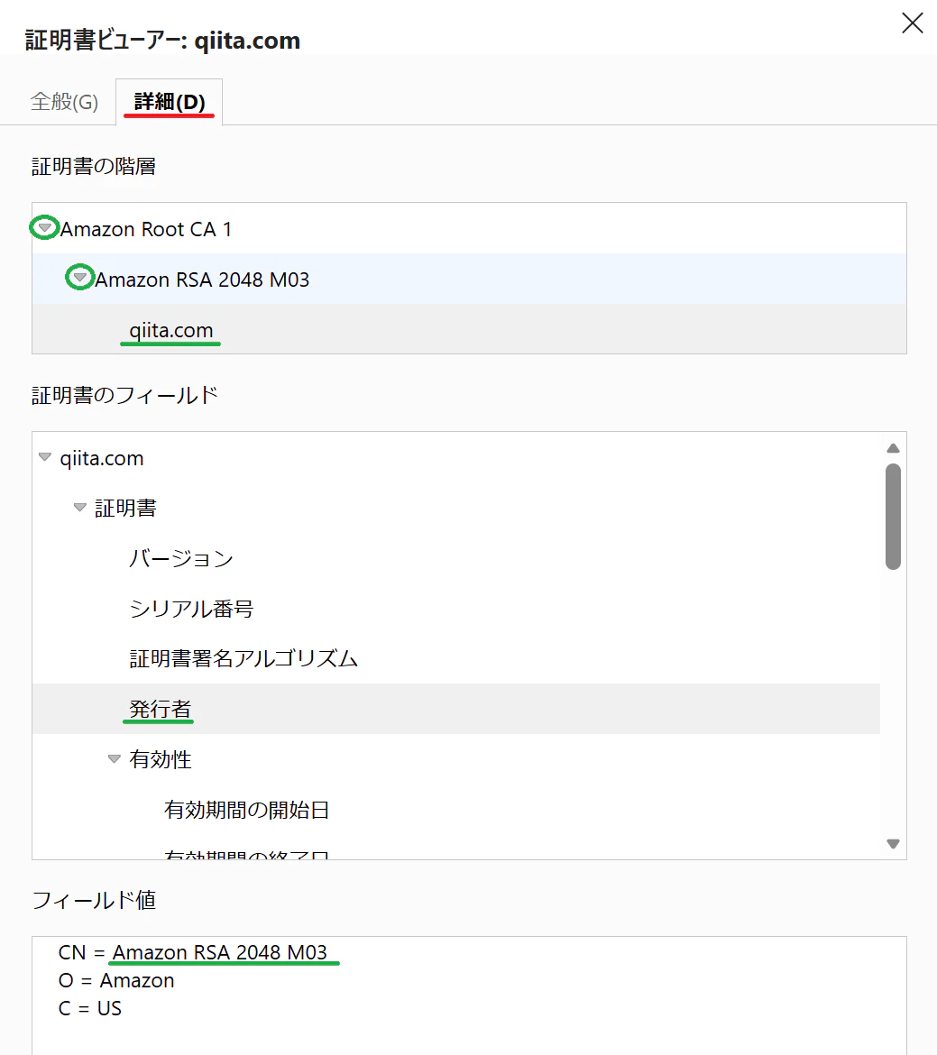 qiita.com の証明書が Amazon から発行されていることが分かります。