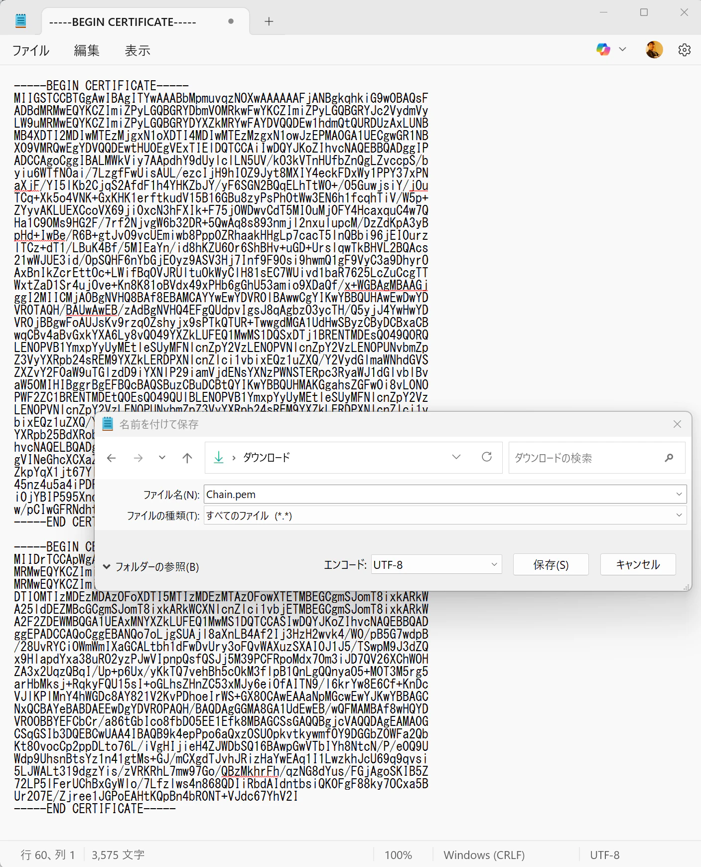 4.メモ帳を新規で開き、以下の図のように 2つの証明書の内容を続けて貼り付けます。