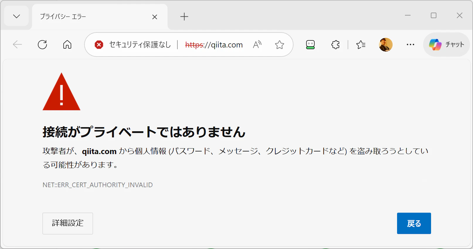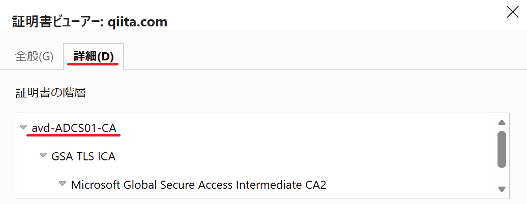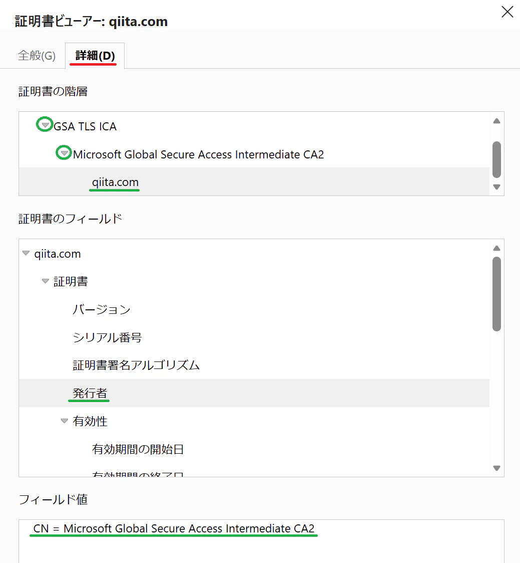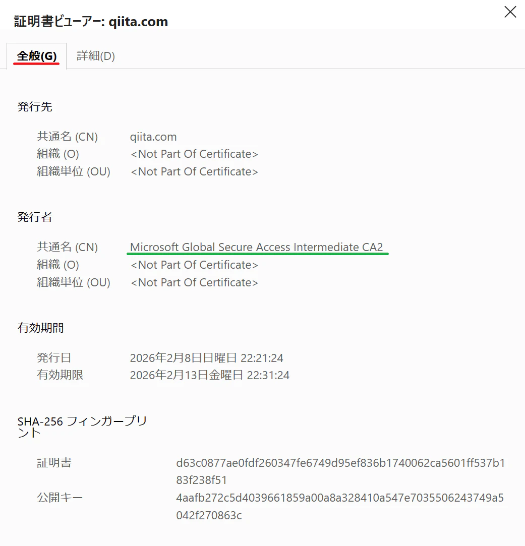 qiita.com の証明書が Microsoft Global Secure Access Intermediate CA2 から発行されていることが分かります。