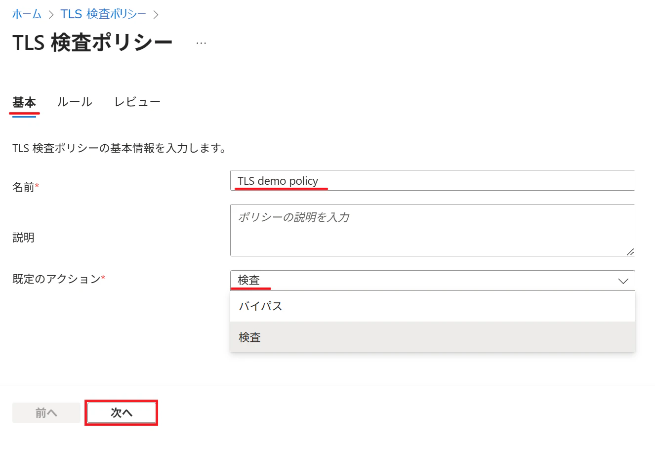 1.基本 タブでは TLS インスペクションであることが分かる名前を付与し、検査 を選んで 次へ を押します。