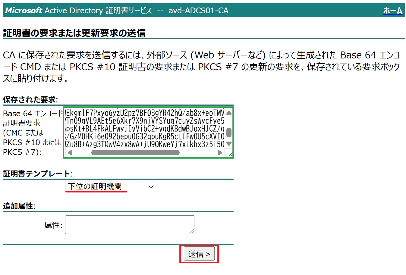 5.コピーした CSR を 以下の緑枠の箇所に貼り付けます。証明書テンプレート は、下位の証明機関 を選択(重要)して、送信 をクリックします。