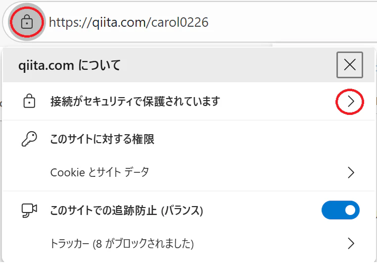 鍵のマークをクリック後に、接続がセキュリティで保護されています の右側の赤丸をクリックします。