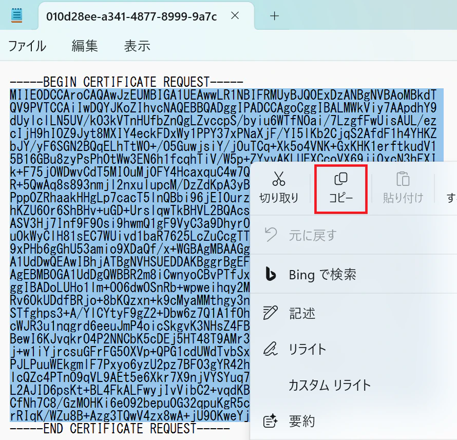 4.前章でダウンロードした CSR をメモ帳で開き、下図の範囲を選択して コピー します。