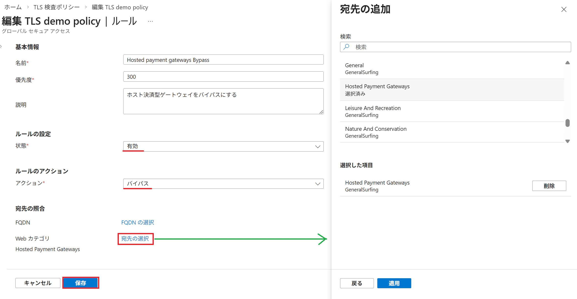 ここで 検査 として割り当てられた カテゴリ や URL が TLS 検査の対象となります。