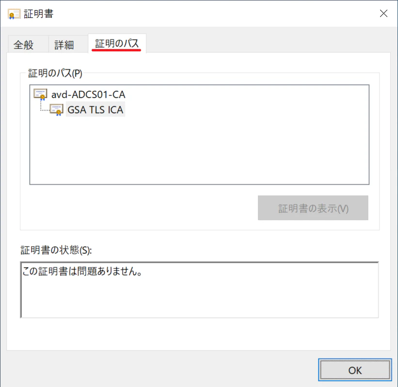詳細タブ を見ると、ADCS の ルート証明書からの4階層になっていることが確認できます。