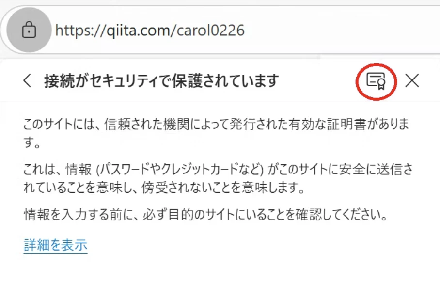 以下の画面に変わるので、赤丸 の箇所をクリックすることで、証明書の情報を表示できます。
