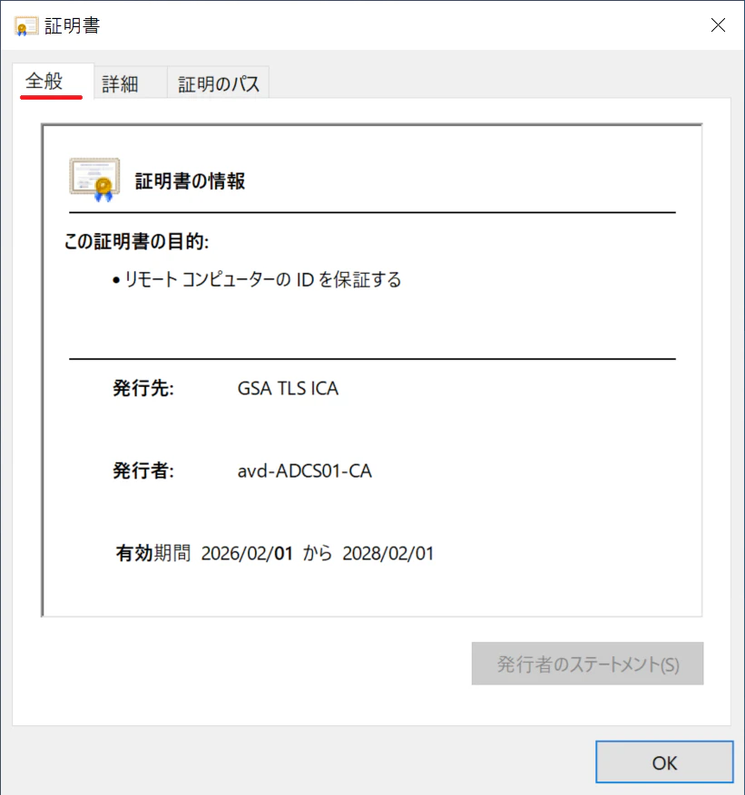 上記の証明書をダブルクリックして開くと、以下の情報を確認することができます