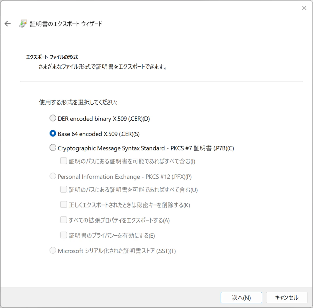 ※エクスポートする際には、以下の通り、Base 64 を選択してください。