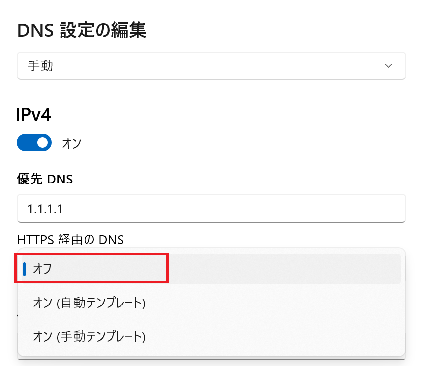 ・日本語 = 「HTTPS(DoH)の名前解決による DNS を構成する」