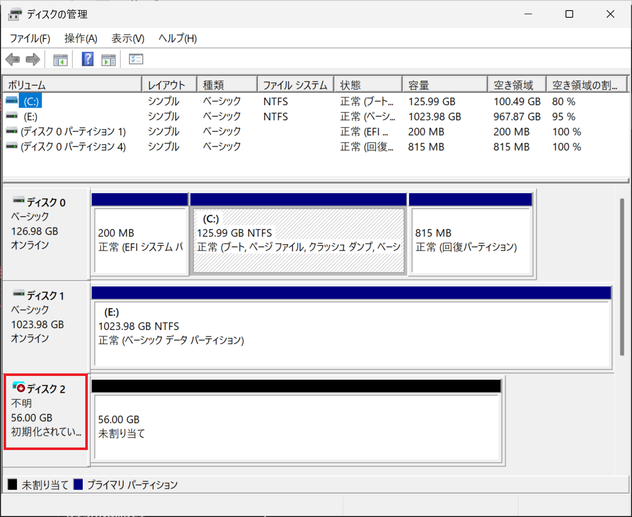 前章で VHDX ファイル上 に作成したパーティションが表示されていることが確認できます。