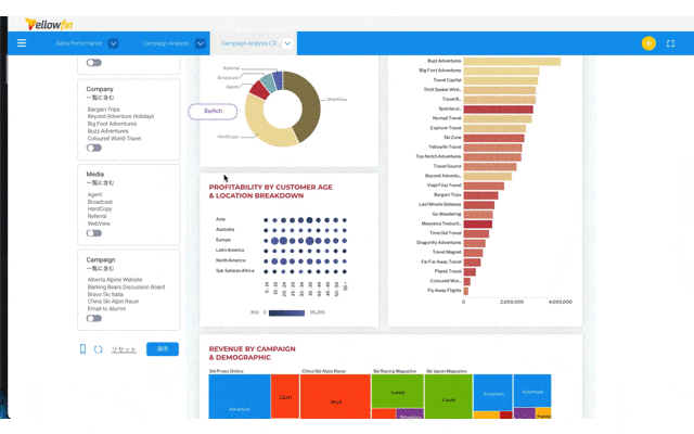 これまでYellowfinv9が発表されてからいろいろなダッシュボードのカスタマイズを検証してきましたが、今回はダッシュボードに表示されているレポート全てをボタンクリックでグラフ表示・表の表示を切り替える方法を試してみました。