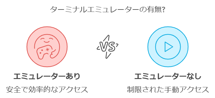 | 特徴 | ターミナルエミュレータがあるとき | ターミナルエミュレータがないとき |