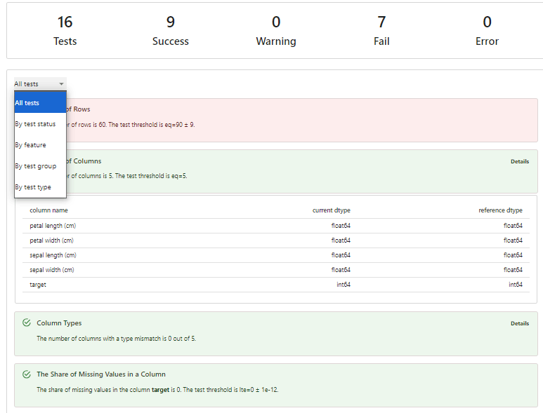 - 表形式データの品質: 欠損値、重複、空の行または列、最小-最大範囲、新しいカテゴリ値、相関の変化など。