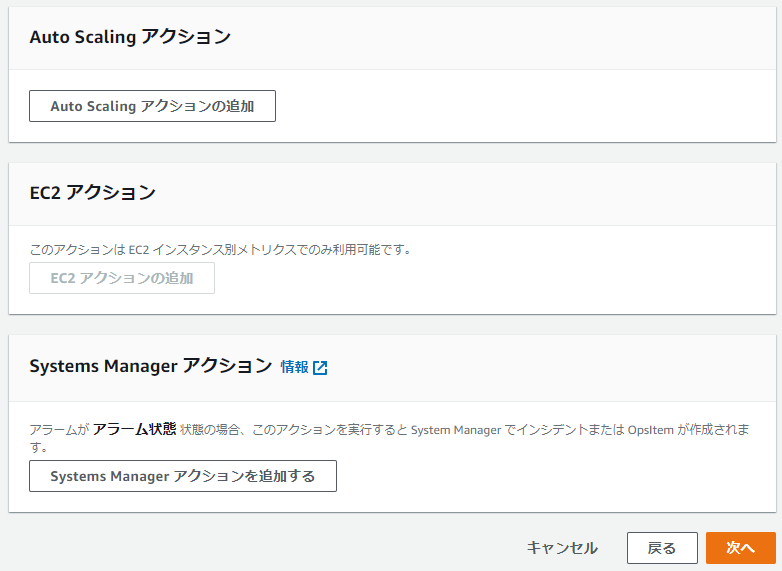 アラーム名はCloudWatachのアラート一覧に表示されるので、わかりやすい名称を入力します。