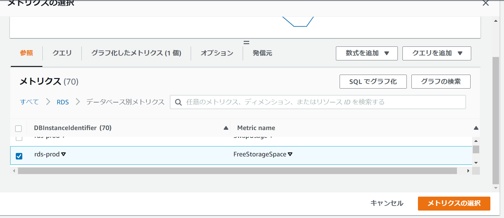 該当するデータベースの「FreeStorageSpece」にチェックし、メトリクスの選択をクリックしてます