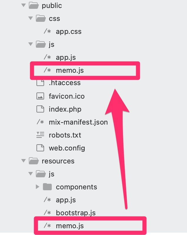 実行することで「resources/js/memo.js」が「public/js」配下にコピーされる