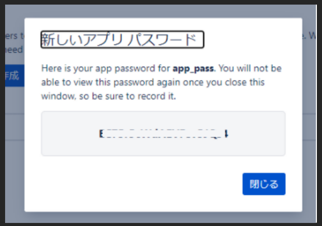 新しいパスワードが生成されたら、表示されているパスワードを忘れないようにメモして下さい。(後から確認はできません)