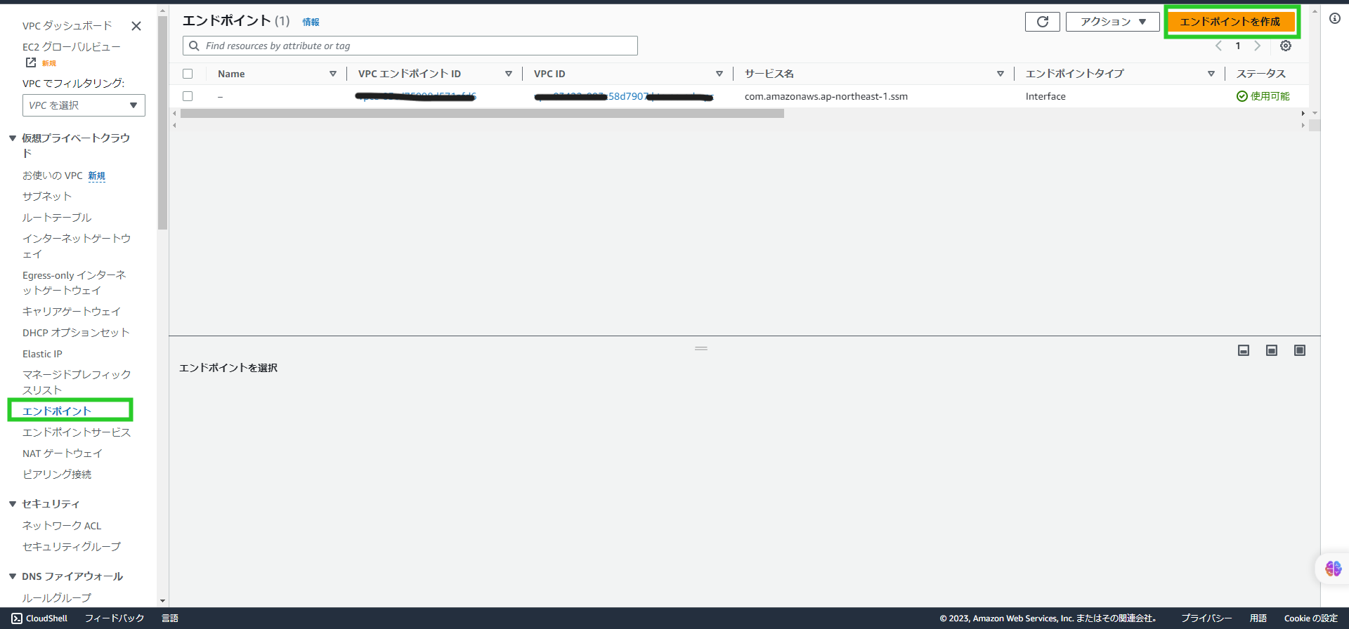 - 「VPCエンドポイント」のページに移動し、「VPCエンドポイントの作成」をクリックします。