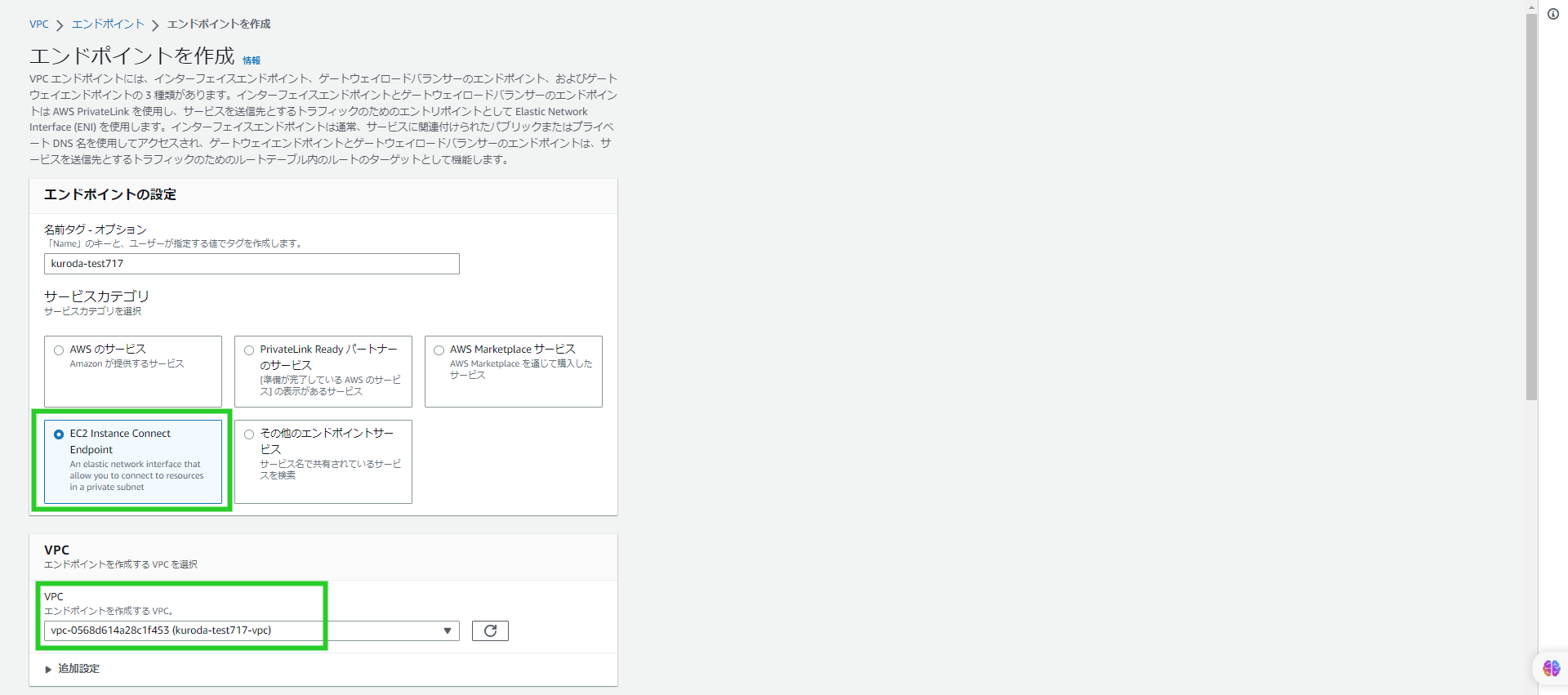 「サービスカテゴリ」セクションで、EC2 Instance Connect Endpointを選択します。