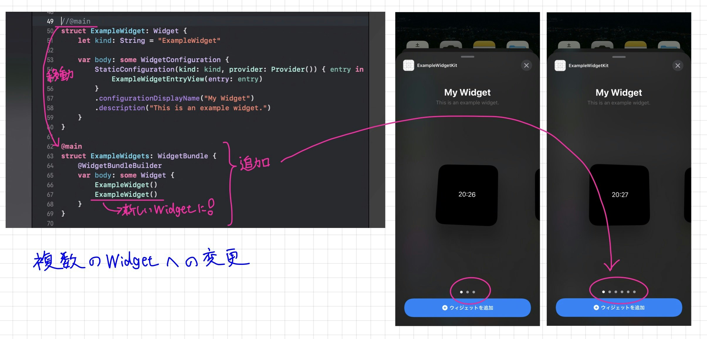 上記のGameStatusWidgetの例では、@main属性を使用して、ウィジェットエクステンションの単一のエントリーポイントを指定しています。複数のウィジェットをサポートするには、複数のウィジェットを body プロパティでまとめた > WidgetBundle に準拠した構造体を宣言します。このwidget-bundle構造体に@main属性を追加して、拡張機能が複数のウィジェットをサポートしていることをWidgetKitに伝えます。