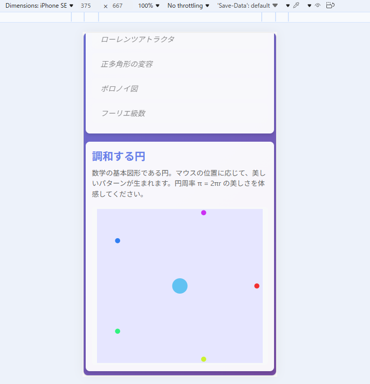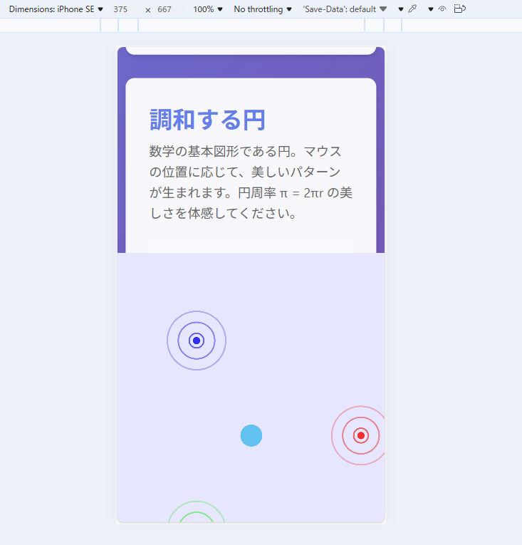ブラウザの開発者モードでiPhone SEにしてみた「調和する円」