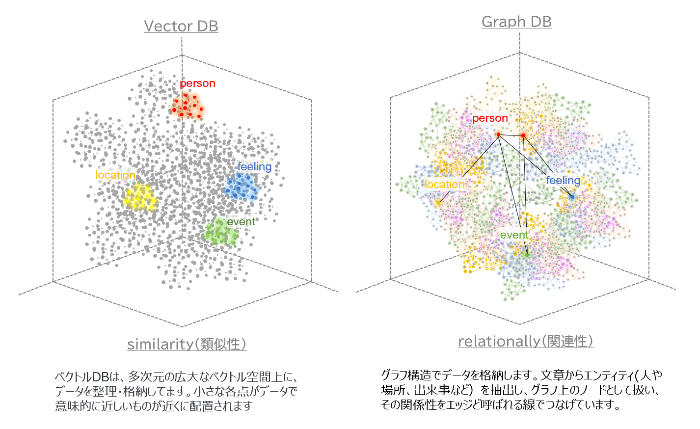 - それぞれのDBに格納する前の前処理も異なります。VectorDBでは、主に文章をチャンク化(分割化)した後に、ベクトル変換して数値化してから格納します。文書単位でベクトル化すれば文書の類似性に基づき場所がきまり、単語単位でベクトル化して格納すれば、その単語の類似性で近しい場所に格納されます。一方、GraphDBでは、文章をチャンク化(分割化)した後に、その文章内にある、エンティティを抽出し、そのエンティティ間の関係性をグラフドキュメント化して、グラフDBに格納します