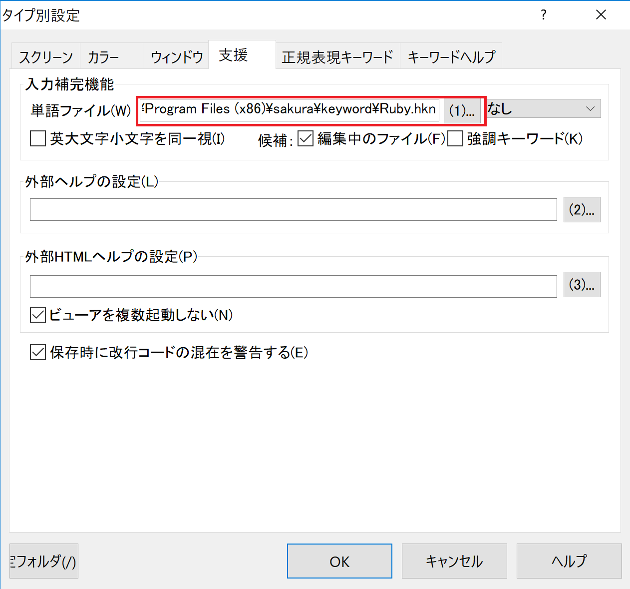「(1)…」の隣の四角に「C:\Program Files (x86)\sakura\keyword\Ruby.hkn」なっているのを確認っす!!
