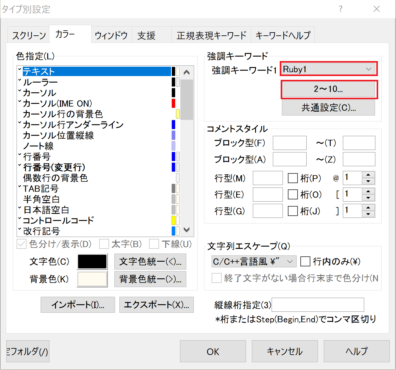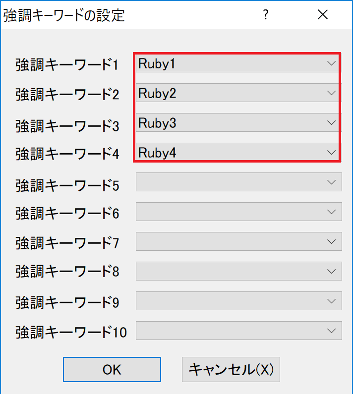 「強調キーワード1」を「Ruby1」にセットし「2~10…」を押下するのさ。
