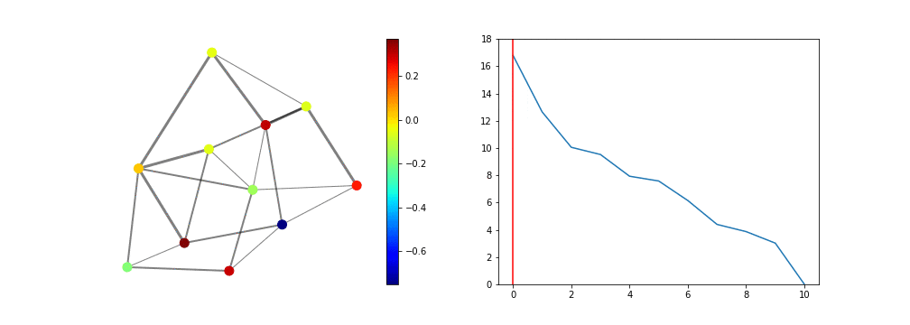 ここで重みが大きい程、エッジが太くなるように表現しています。さて、今度はグラフLaplace行列を計算して、その固有値と固有ベクトルを求めましょう。