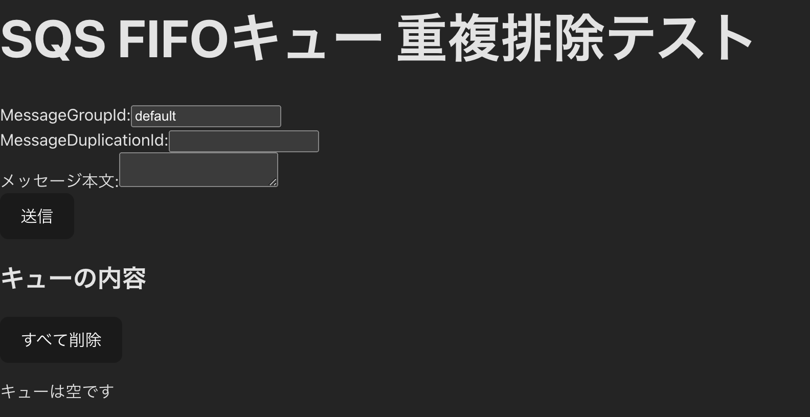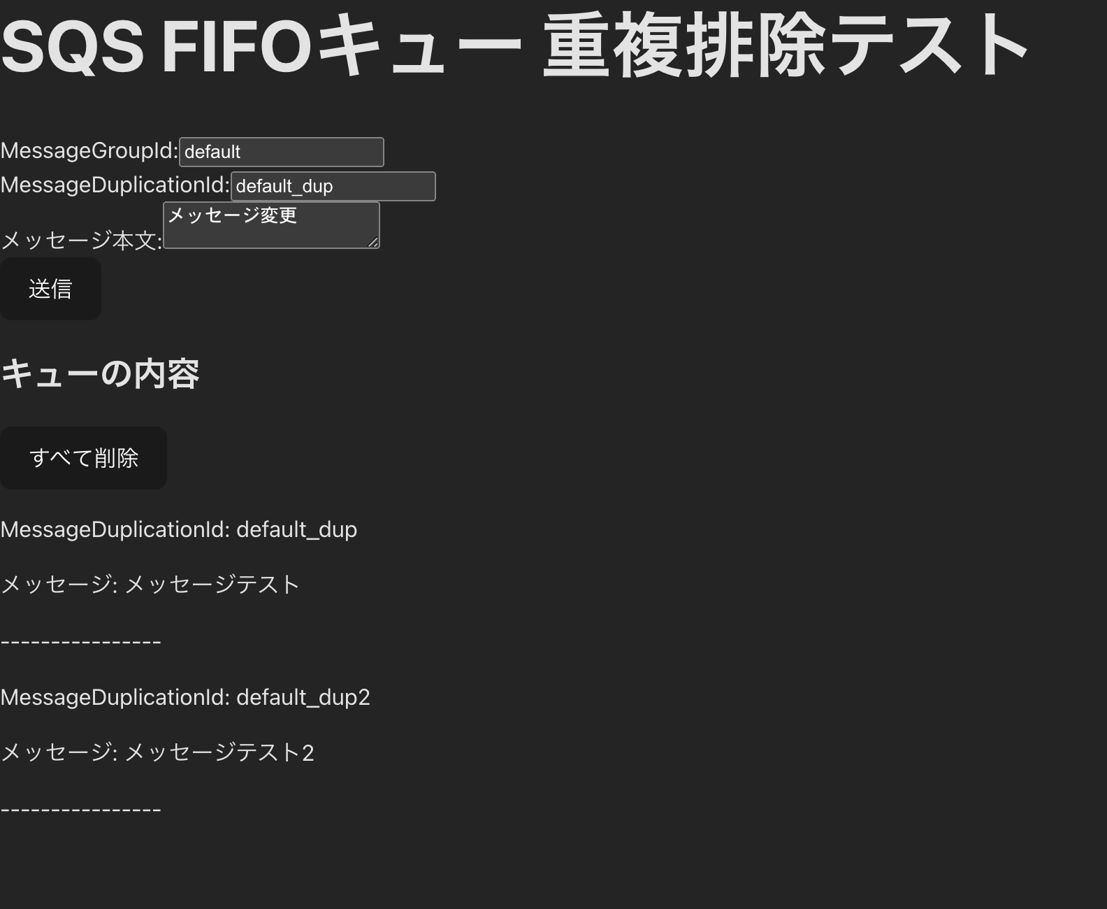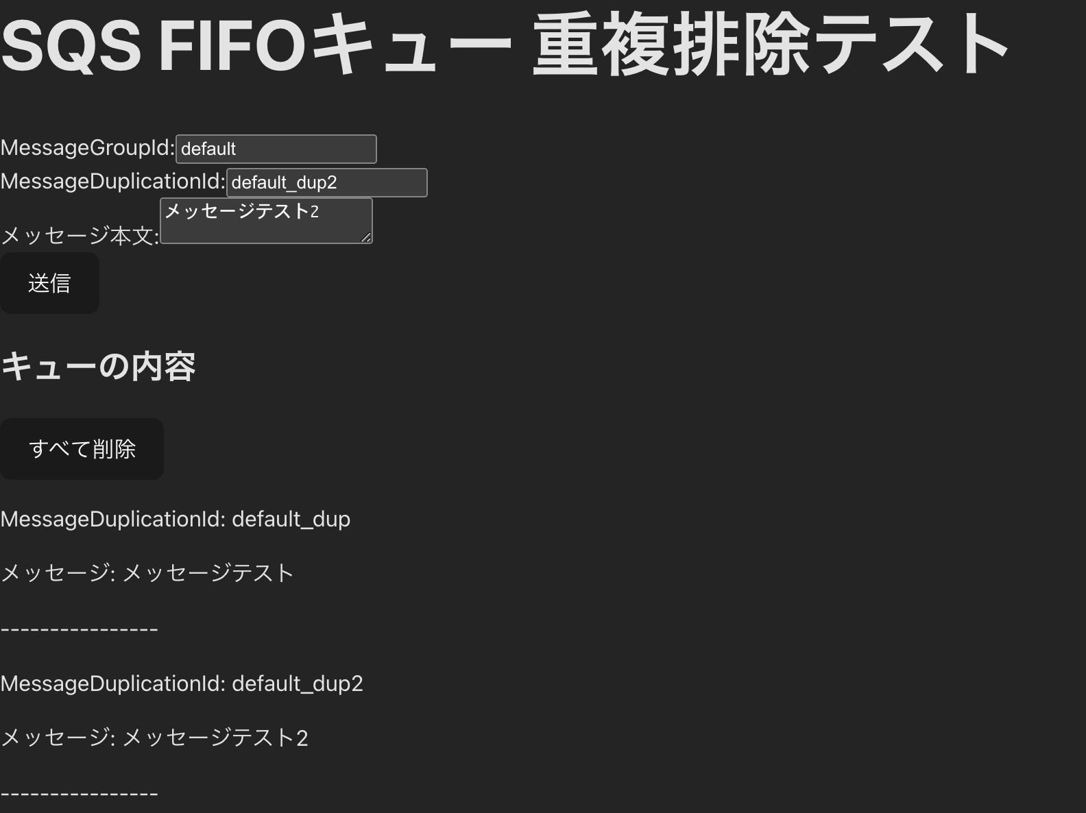 ここで、はじめに入力したものと同じMessageDeduplicationIdを設定してみます。
