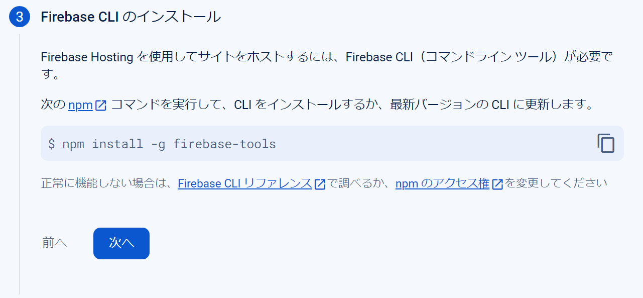 用途に沿って内容を選択する。下記は「firebase hosting」で公開するための選択内容となる。