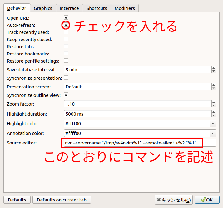 上記のコマンドをqpdfviewが自動的に行なうために、メニューバーのEdit>>Settingsから、つぎの画像のように設定します。