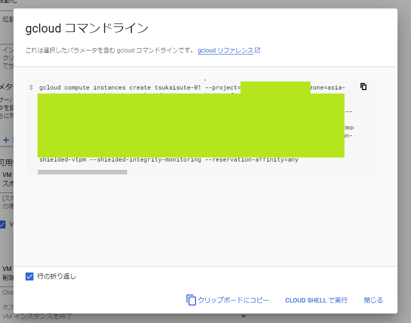 これにて、VMインスタンス生成用のコマンドを取得しました。(ただ、このままでは動かないです。22年12月現在)