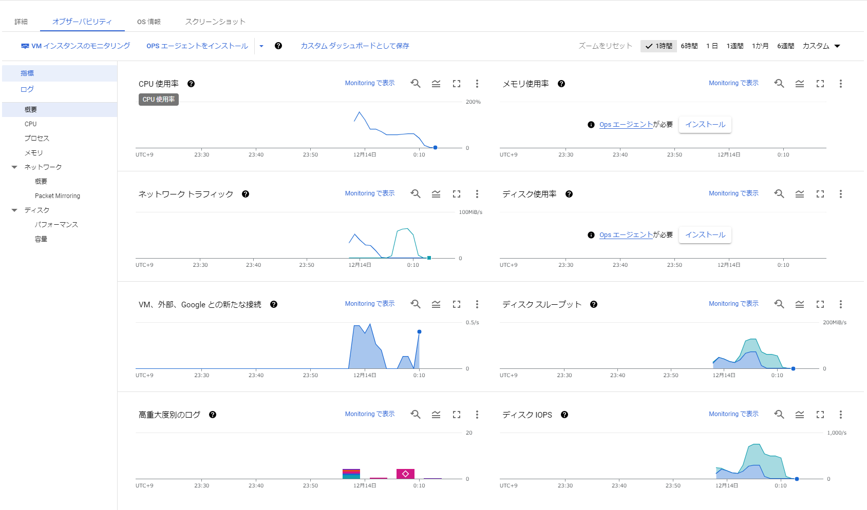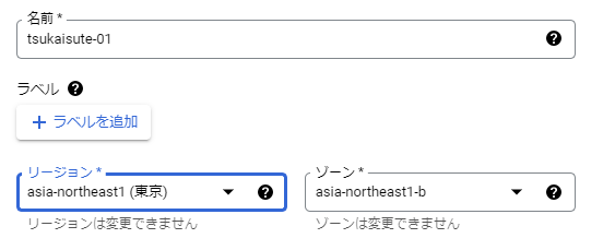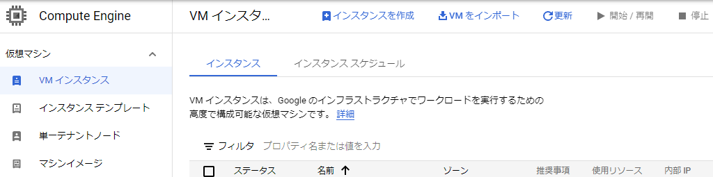 VMインスタンスページに移動後、「+インスタンスを作成」をクリックしてインスタンスの作成時の設定画面に入ります。