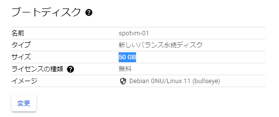 ブートディスクのサイズはデフォルト10GBなので、50GBとしました。10GBのファイルを変換したかったので、少し増やしました。