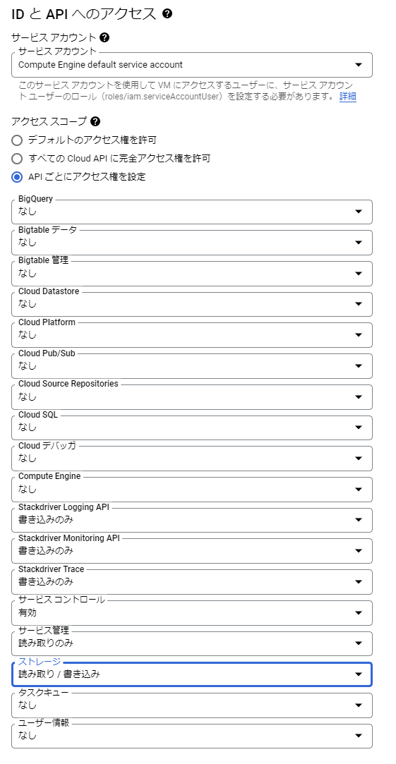 アクセススコープはAPIごとにアクセス権を設定を選択します。今回はCloud Storageから変換元ファイルのダウンロードと、変換後ファイルのアップロードを行うため、ストレージは「読み取り/書き込み」に変更します。