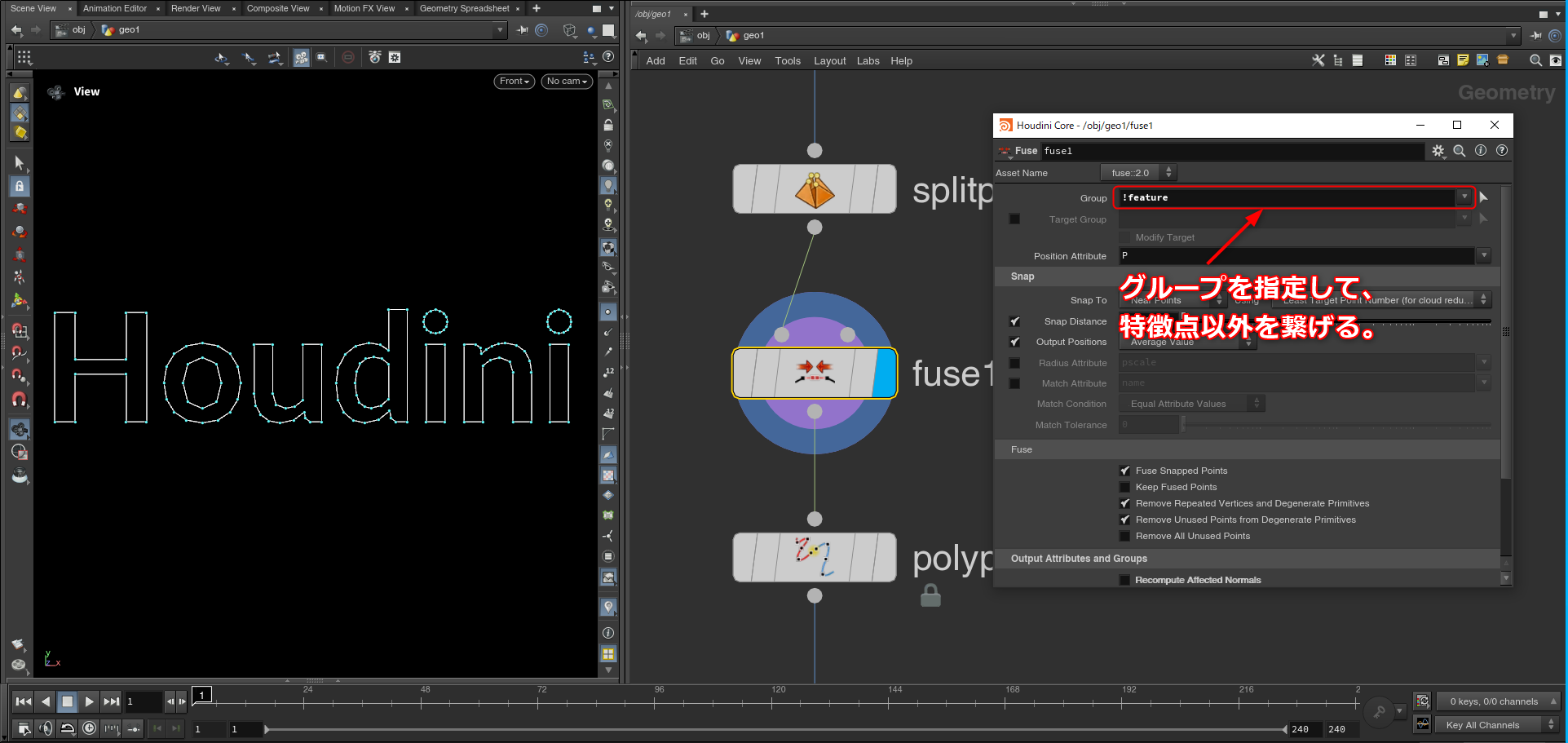 次にFuseノードを繋げ、Group欄に!featureと指定し(!を付けることで指定したグループ以外になります)、先ほど取得した特徴点以外のポイントを繋げます。