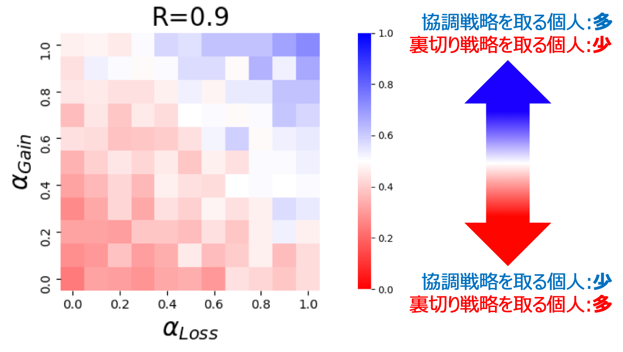 この図では、各利得のパラメータが表す領域が青いほど協調率を取る個人の数が多くなり、領域が赤いほど裏切り戦略を取る個人が多くなることを表しています。
