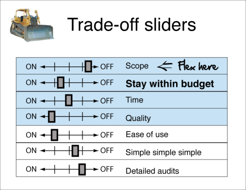 アジャイル開発では、トレードオフスライダーを用いて、プロジェクトの中でなにがより優先すべきかを定義し、調整の際に何を犠牲にするかの指針を作る工夫をしています。