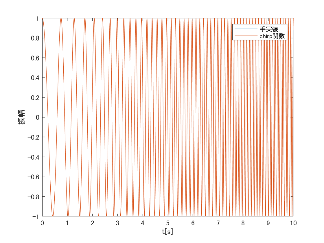線形チャープ信号を手実装してみたが,matlabにはchirpというチャープ信号を生成する関数が標準で備わっている.