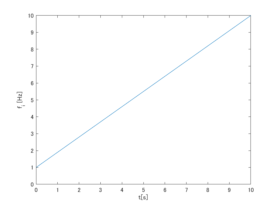 $t=0[\rm{s}]$で$1[\rm{Hz}]$の信号が,周波数が線形に増大していき,$t=10[\rm{s}]$で$10[\rm{Hz}]$になる線形チャープ信号を考える.