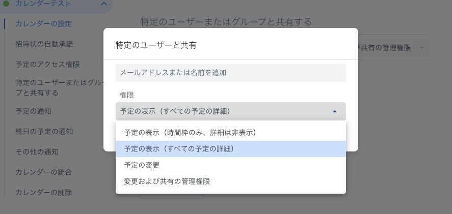 UIでは、カレンダーの設定 -> [特定のユーザーまたはグループと共有する]