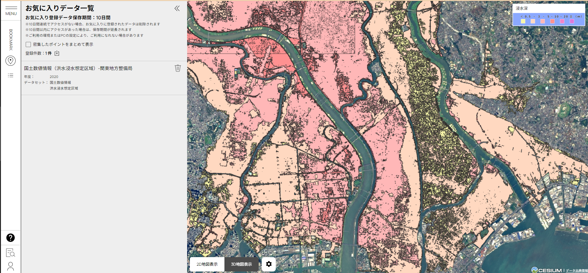 この作品では浸水想定区域や全国道路施設点検データベースや、直轄工事・業務の成果品データを活用しているそうです。