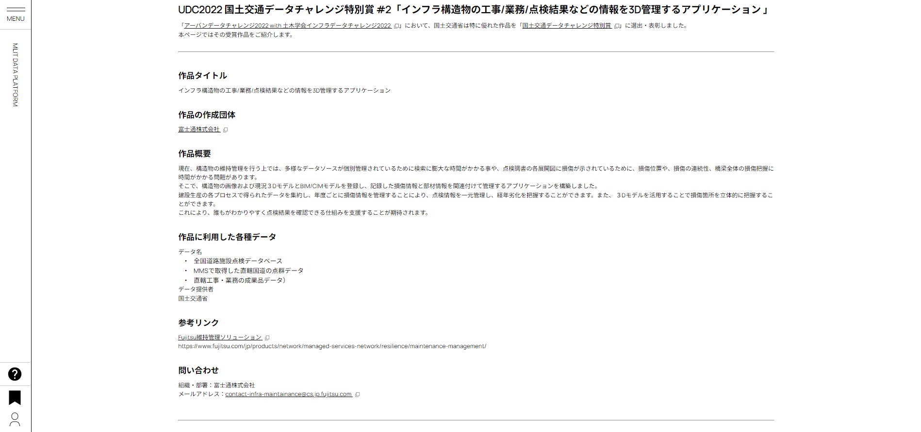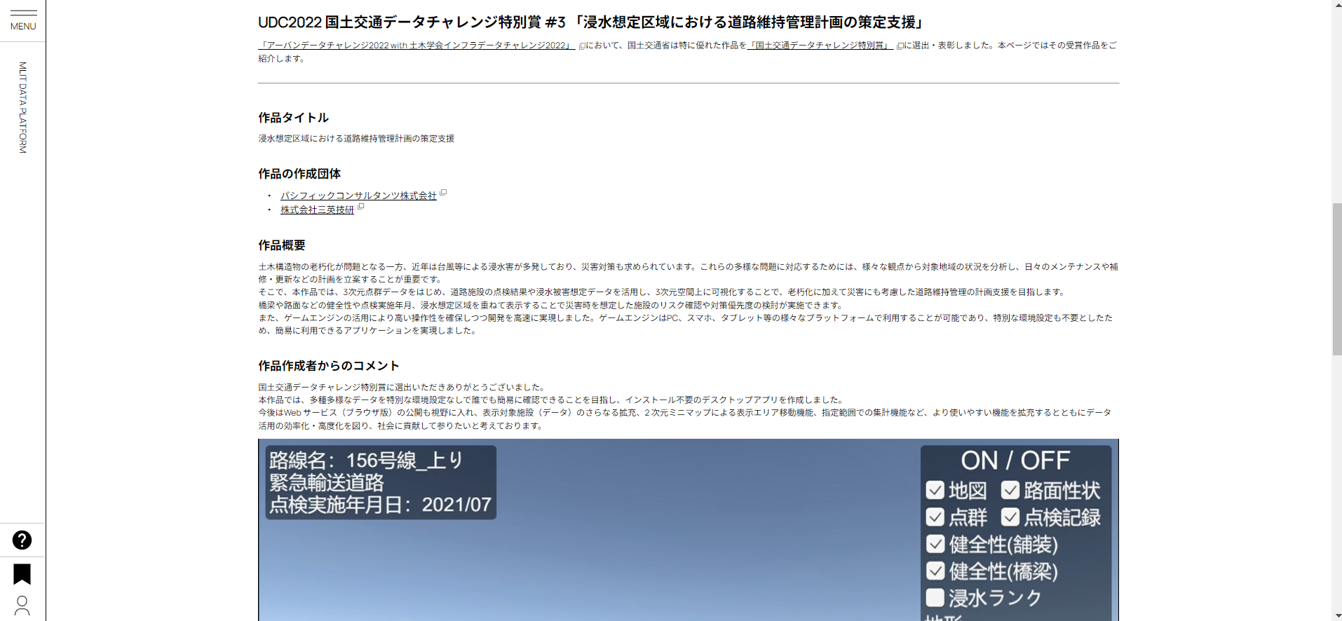 ちなみにこの作品は国交DPFにも掲載されている全国道路施設点検データベースや、直轄工事・業務の成果品データを活用しているそうです。