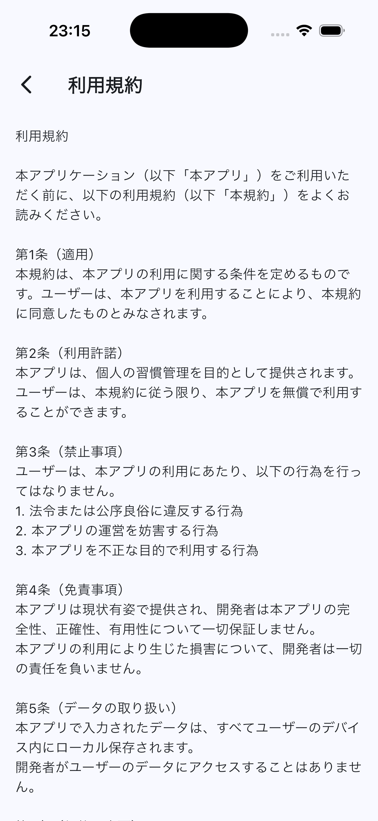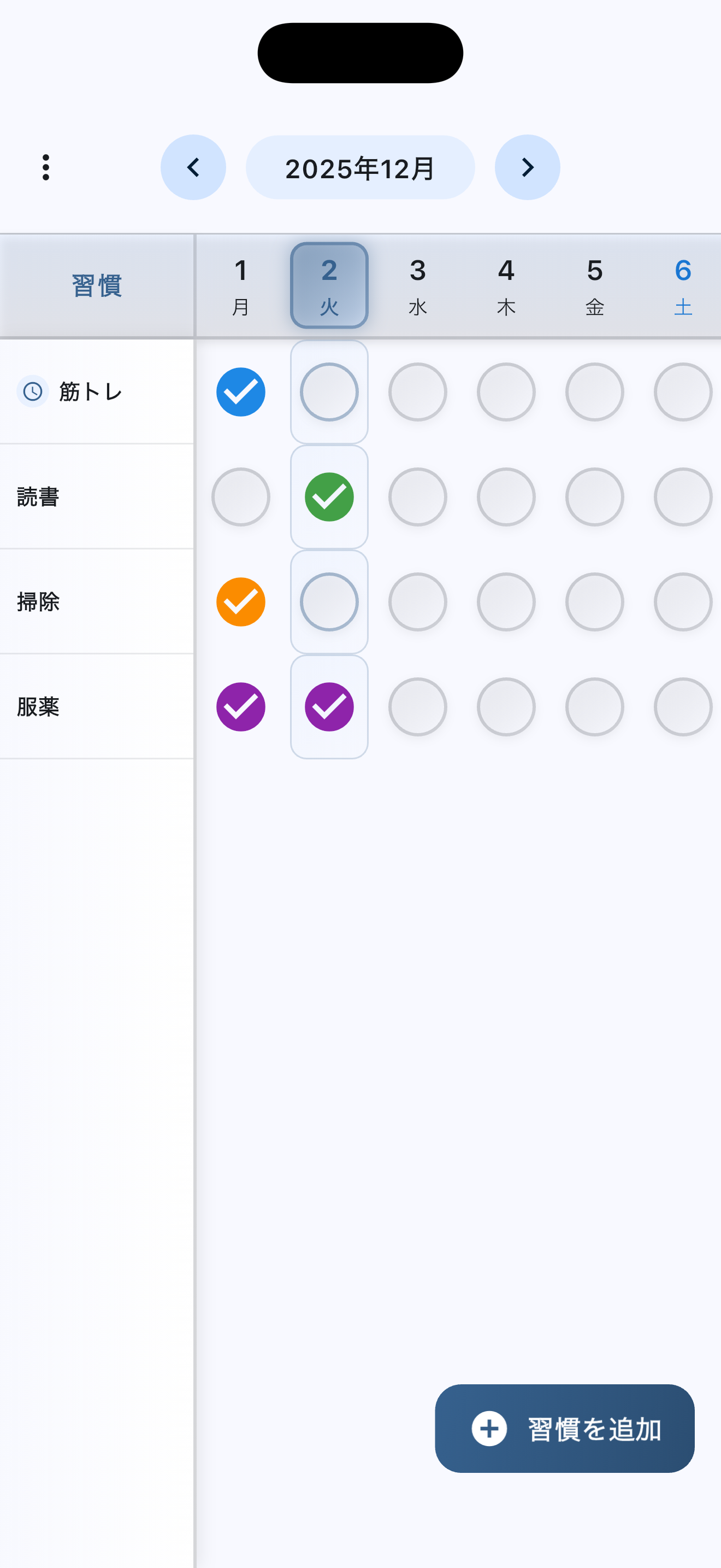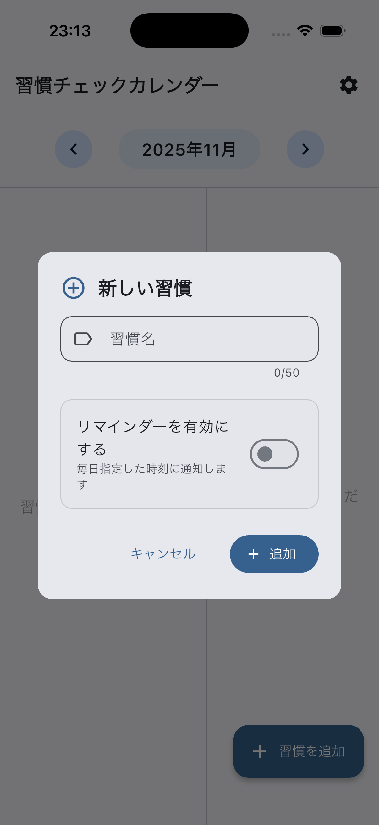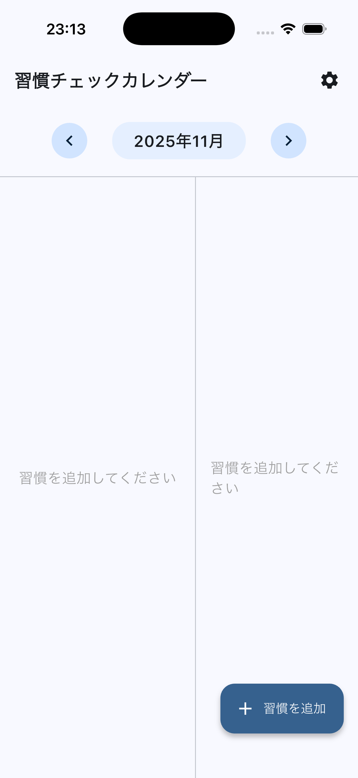 習慣チェックカレンダーは、ユーザーが日々の習慣を記録し、カレンダー形式で視覚的に確認できるシンプルなモバイルアプリケーションです。ローカルストレージにデータを保存し、プッシュ通知でリマインダーを提供します。