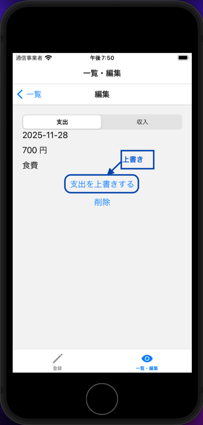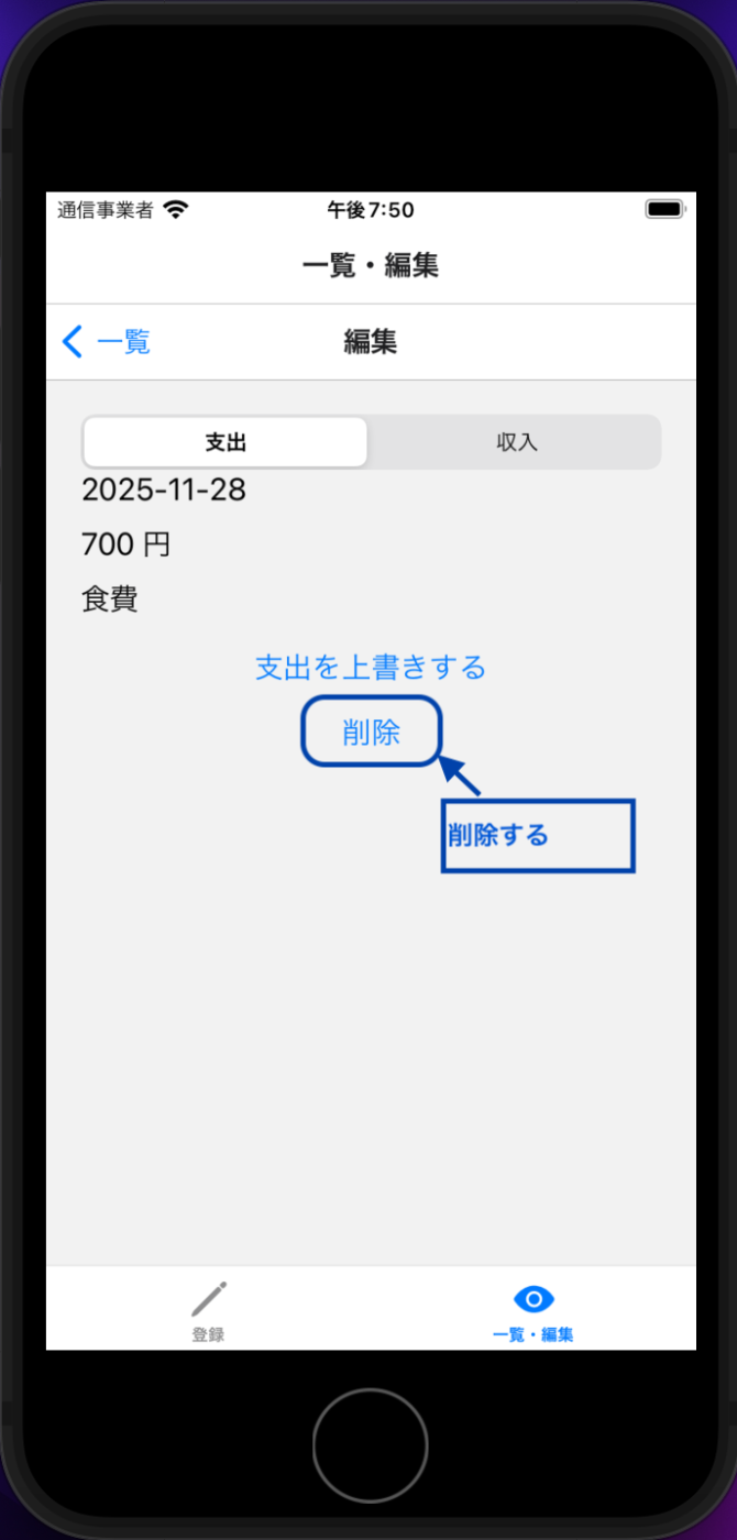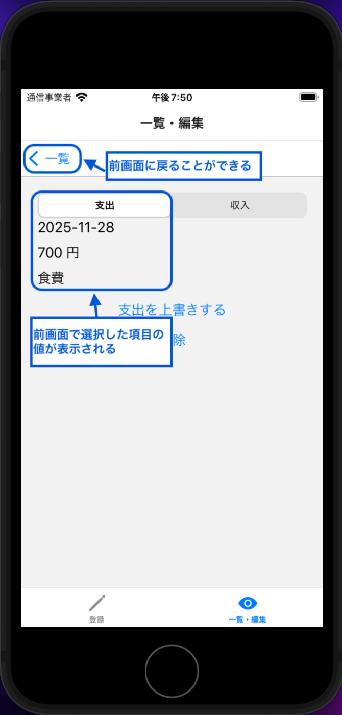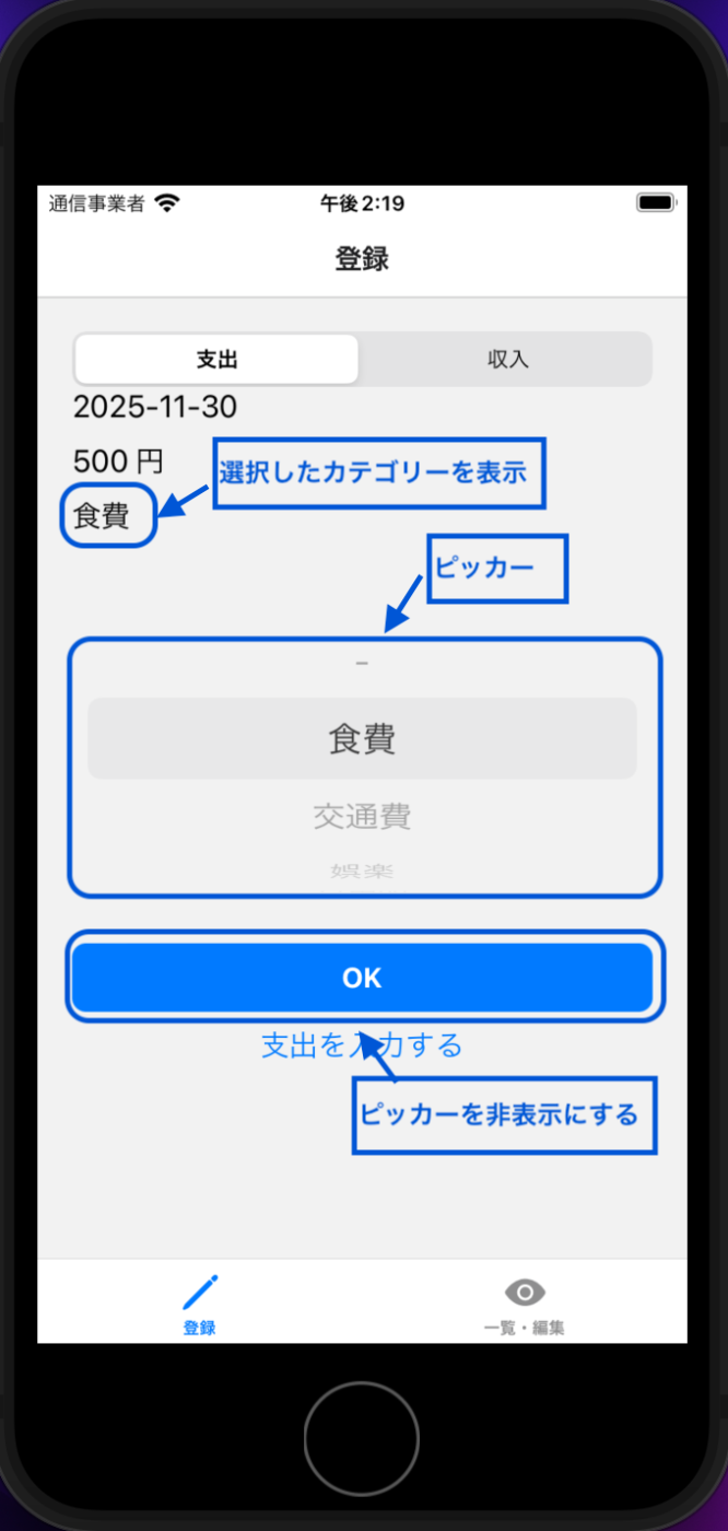 1-2. 分類(例. 支出、収入)の画面切替 -