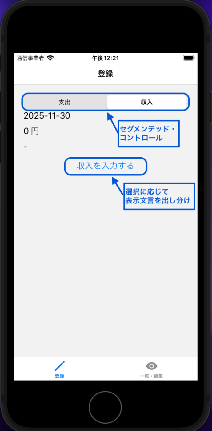 画面上部の「セグメンテッド・コントロール」を選択すると画面を切り替える。