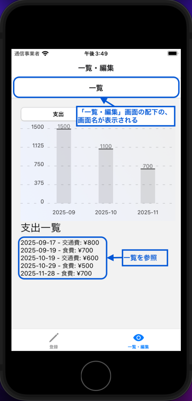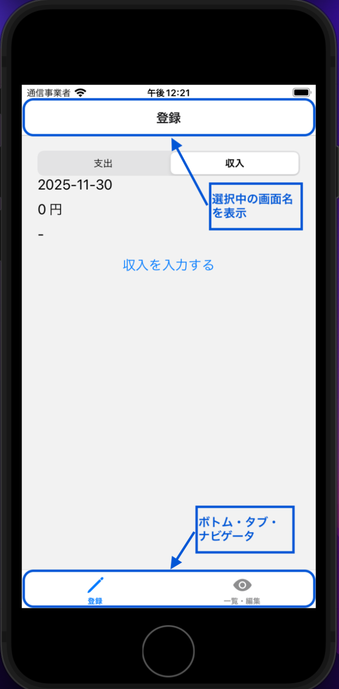 画面下部の「ボトム・タブ・ナビゲータ」で選択した画面に切り替える。