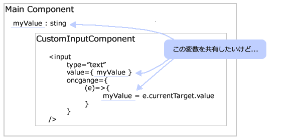次の例は、 MainComponent と CustomInputComponent で変数の実態を共有する例です。